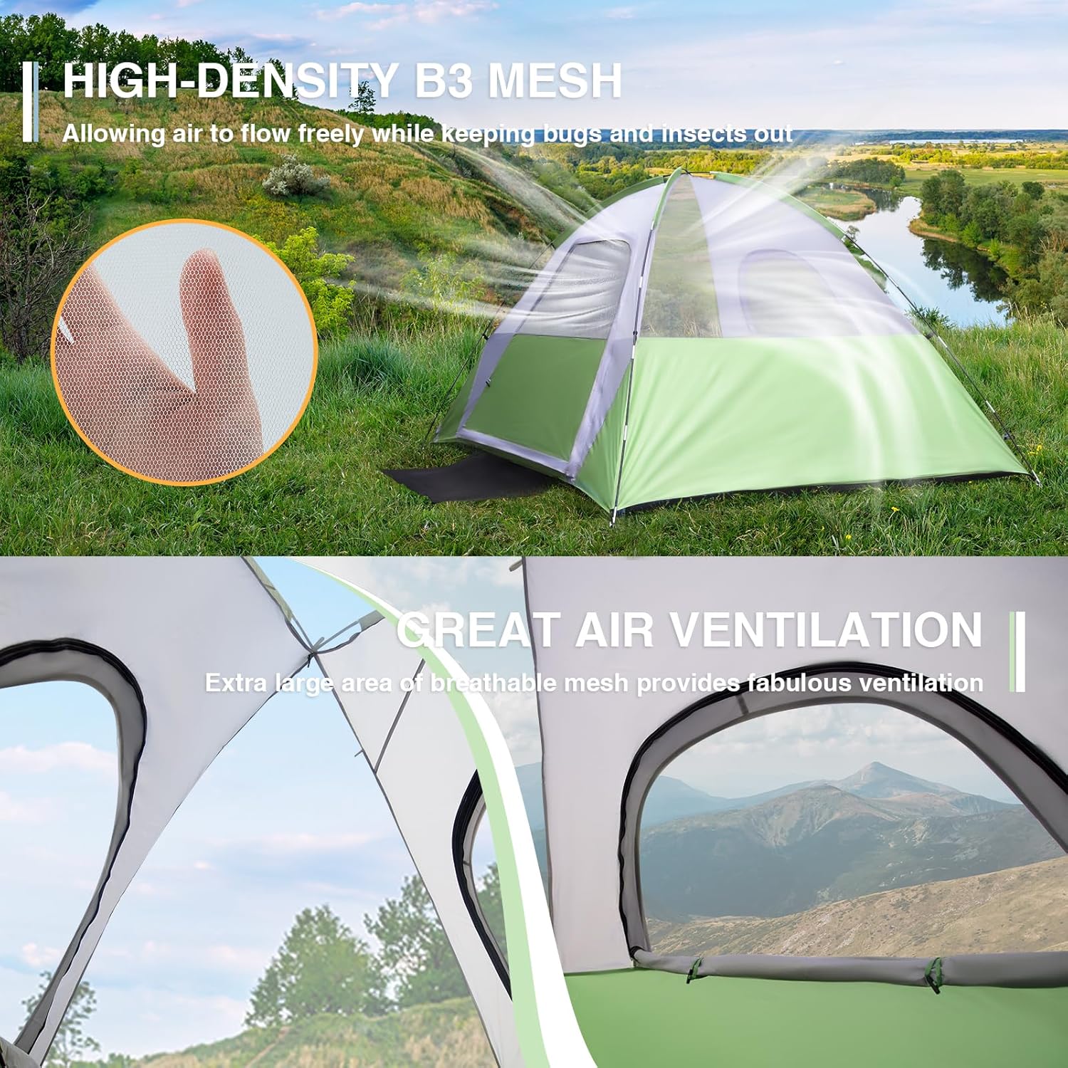 - Ventilation Excellence & Panoramic Views:This camping tent combines ventilation,ease of entry and exit,providing options Views. Doors with a D-shaped design for easy entry and exit.This inner layers tent features placed B3 mesh panels and large windows for immersive views of your surroundings,providing optimal airflow and preventing that stuffy feeling while camping.Ventilated mesh windows are both breathable and keep bugs out.