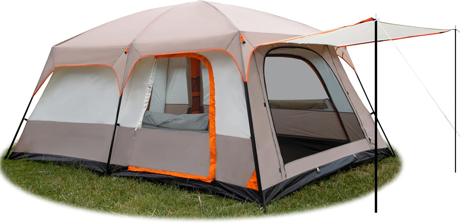 - Large space:Inside dimension14.1ftlength*10ft width*6.58ft height, fit 4 full air mattresses(6.7ft*5ft/200cm*150cm),can accommodate 12 person.straight wall design, interior space is larger and more comfortable.There are 2 rooms with 8 top corner hooks and a middle hook.